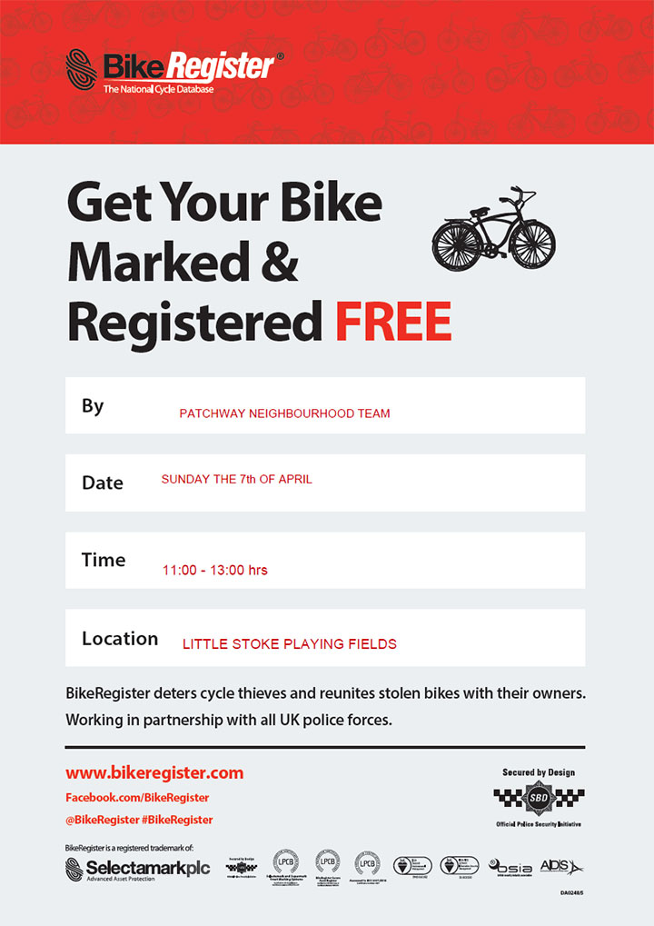 Patchway Neighbourhood Police Team will be marking and registering bikes for free at Little Stoke Playing Fields on Sunday 7th April 2024.