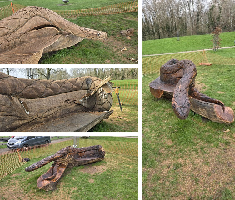 The wood carver that produced the popular snake seat at Meade Park has returned to give it a much-needed refresh.